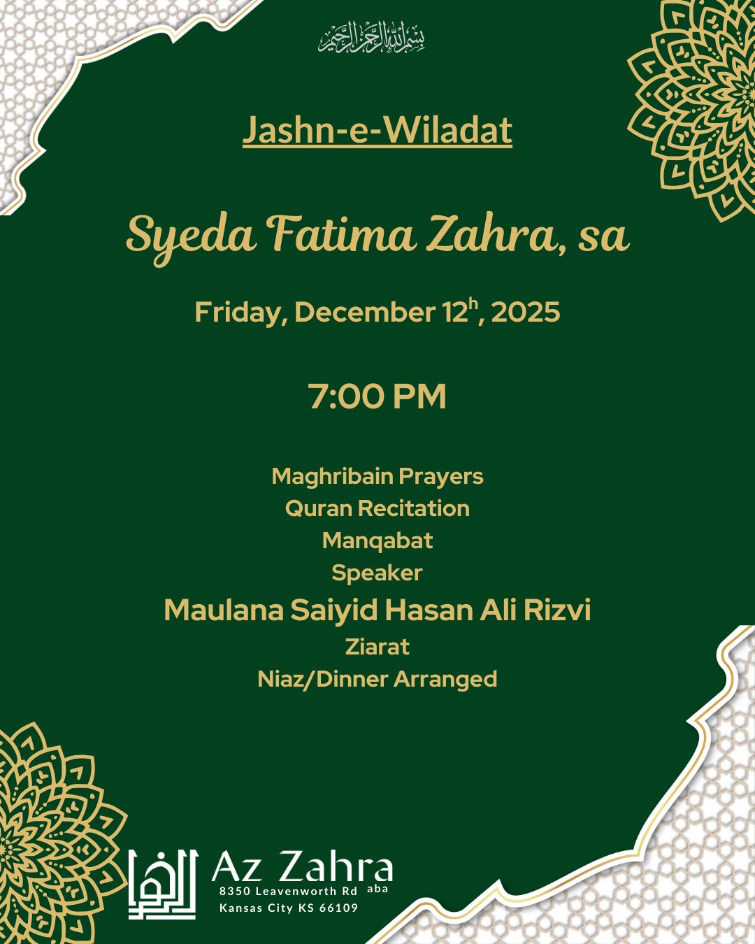 Jashn-e-Wiladat Sayyida Fatimah al-Zahra (p) Friday, Dec 12th 2025, 7:00 PM Speech by Maulana Saiyid Hasan Ali Rizvi Dinner is arranged.