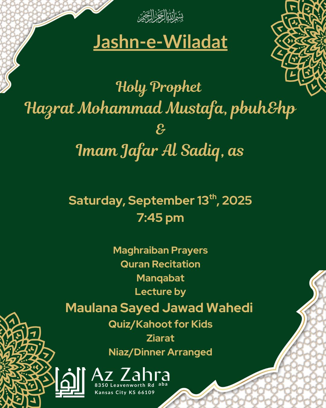 Jashn Wiladat Prophet Muhammad (pbuh&hp) and Imam Ja’afar As-Sadiq (p) By azwpadmin | September 10, 2025 0 Comment Sat, Sep 13th 2025, 7:45 PM Speaker: Maulana Sayed Jawad Wahedi Dinner is arranged.