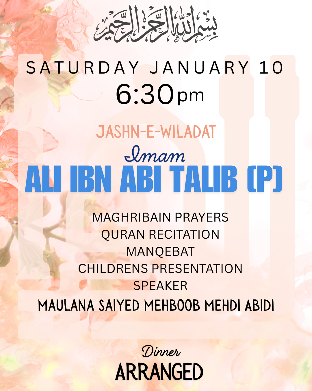 Jashn Wiladat Imam Ali ibn Abi Talib (p) By azwpadmin | January 2, 2026 0 Comment Saturday Jan 10th, 2026 6:30 PM Speaker: Maulana Saiyed Mehboob Mehdi Abidi. The program starts with Maghribain Prayers. Dinner is arranged.